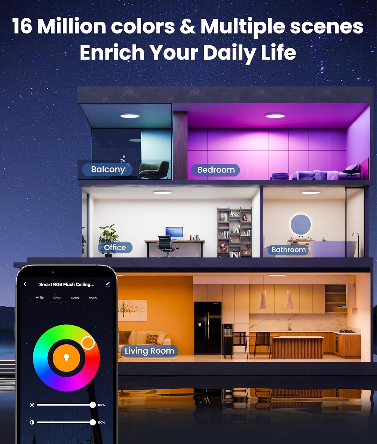 Dimmable RGB & Adjustable White Light Create the perfect ambiance with 16 million colors and tunable white light (2700K–6500K). Choose from 8 scene modes, adjust brightness smoothly from 1% to 100%, and enjoy high CRI 90+ lighting—perfect for your living room, bedroom, or kitchen.